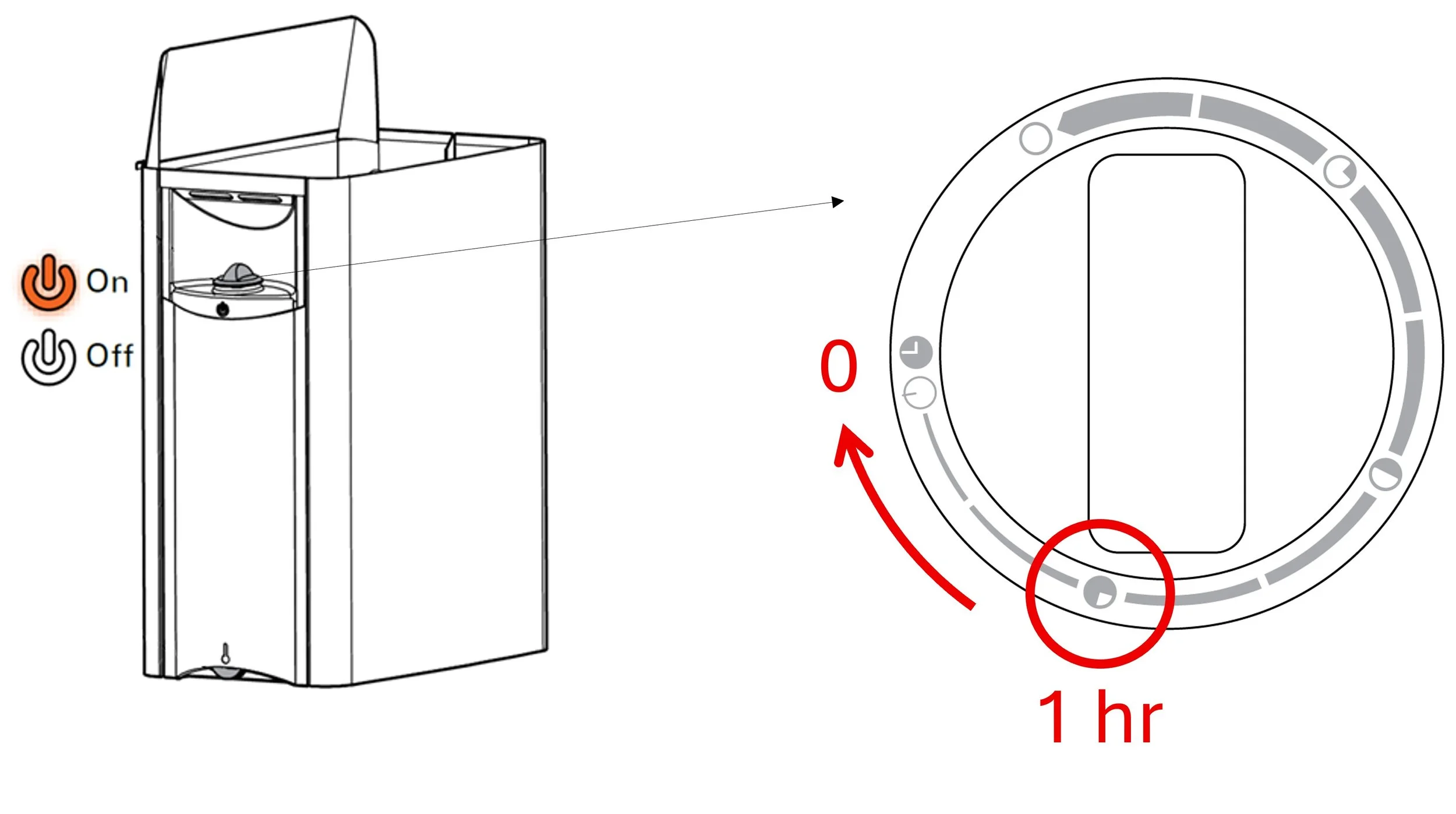 Turn the timer knob on the heater clockwise to the "On" section for around 1 hour (as pictured below). This should provide ample time for the sauna to reach operating temperature and give you 2 or 3 rounds.